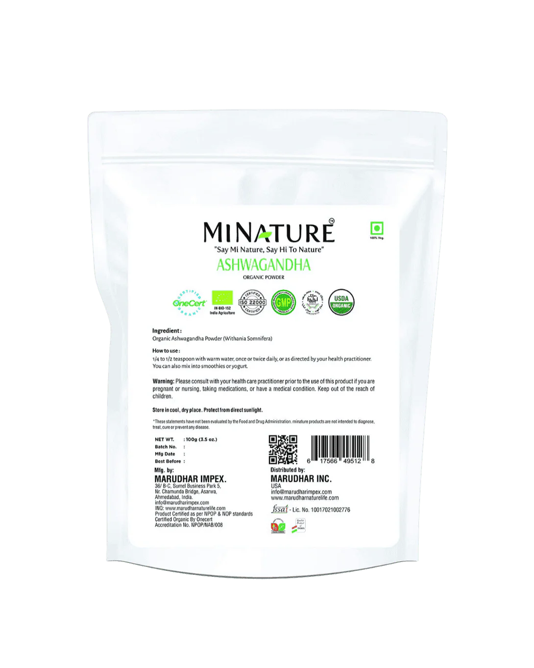 Organic Ashwagandha Powder 227 g - USDA Certified—